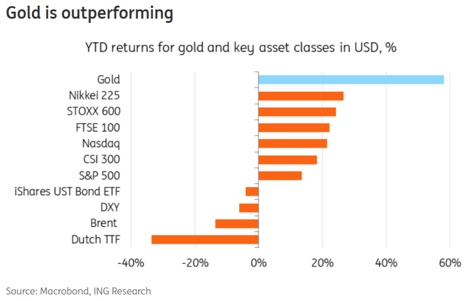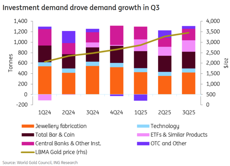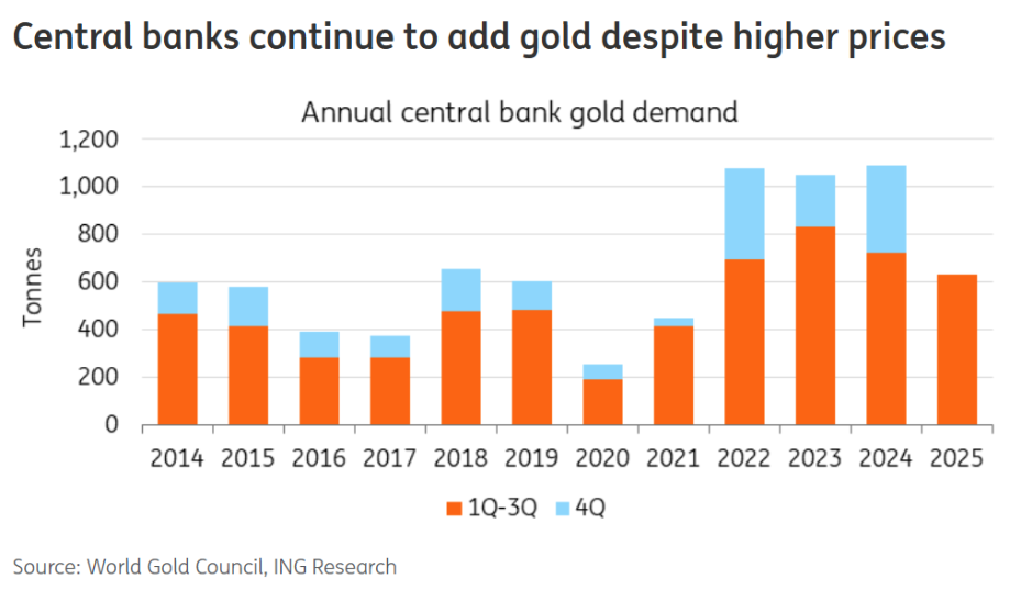 综合所有这些因素,ING 预计 2026 年黄金上涨行情将持续,尽管增速不及今年。