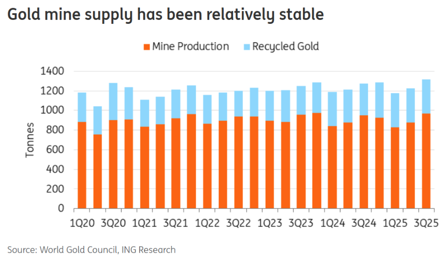 金价的另一潜在阻力是矿产产量增加,但 ING 认为这种可能性不大。
