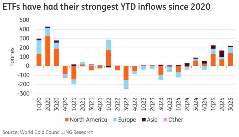 「我们预计黄金 ETF 买盘将升温,因为美联储可能继续降息,而 ETF 买入通常与美联储政策密切相关,」 曼泰表示,「鉴于当前总持仓仍低于 2020 年的峰值,仍有进一步增持空间。更多资金流入可能推动金价进一步上涨。」