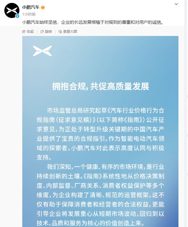 同日,小鹏汽车官博发文称,公司对市场监管总局研究起草的 《汽车行业价格行为合规指南 (征求意见稿)》 表示高度认同与积极支持。小鹏汽车表示,将全面审视并持续优化自身的价格管理与合规体系,确保从产品定价到销售服务的每一个环节都更加透明、规范。承诺将严格遵守明码标价原则,保障消费者的知情权与选择权,坚决杜绝任何形式的价格欺诈与不正当竞争行为。