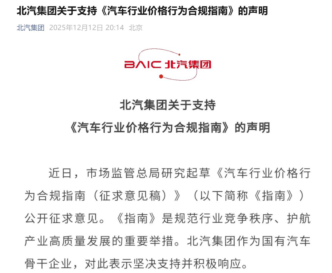 北汽集团也发声明称,近日,市场监管总局研究起草 《汽车行业价格行为合规指南 (征求意见稿)》(以下简称 《指南》) 公开征求意见。《指南》 是规范行业竞争秩序、护航产业高质量发展的重要举措。北汽集团作为国有汽车骨干企业,对此表示坚决支持并积极响应。