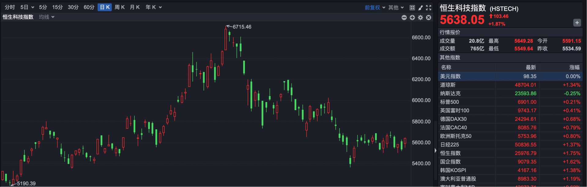 恒生科技指数收报 5638.05 点,大涨 103.46 点,涨幅 1.87%。