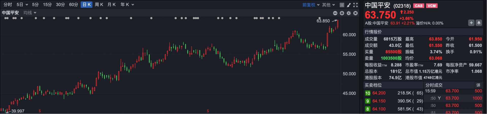 再看今日盘面,对指数起到重要拉升作用的是非银金融板块。其中,保险股整体走强,中国太保 (HK02601)、中国人寿 (HK02628) 涨超 5%,中国平安 (HK02318)、中国太平 (HK00966) 涨超 3%。其中,中国平安创出 2021 年 7 月以来新高。