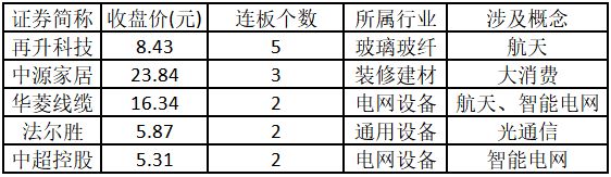 从连板情况来看,今日首板个股有 65 只;2 连板的个股有 11 只;3 连板及以上的个股有 2 只。今日连板数排名前 5 的个股包括再升科技、中源家居、华菱线缆、法尔胜、中超控股,具体如下表所示。