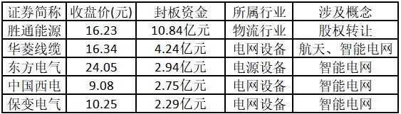 从封板资金来看,今日涨停板个股中,封板资金排名前 5 的个股包括胜通能源、华菱线缆、东方电气、中国西电、保变电气。