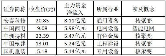 从主力资金来看,今日涨停板个股中,主力资金净流入金额排名前 5 的个股分别为安泰科技、中国西电、中洲特材、中国核建、国机重装。