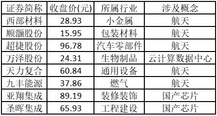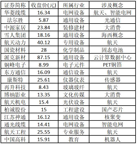 涨停板个股中,股价创出近一年新高的个股有 18 只 (不包括创出历史新高的个股),包括华菱线缆、法尔胜、中源家居、雪人集团、航天动力、国瓷材料、派克新材、铜峰电子、东方通信、康斯特、再升科技、博纳影业、航天机电、柏诚股份、江苏神通、通光线缆、航天工程、中国高科,具体如下表所示。