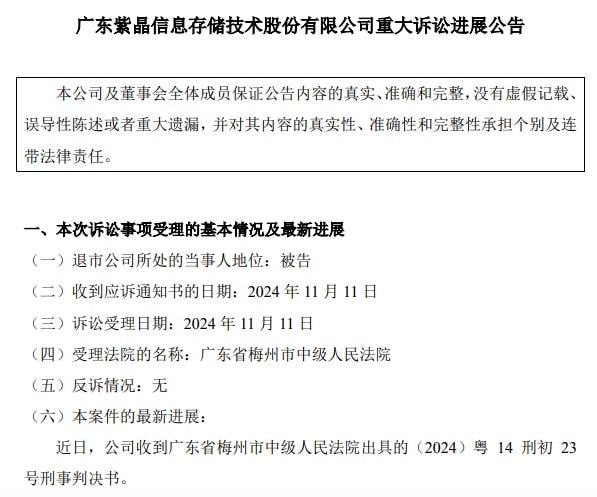 12 月 12 日,因重大违法被强制退市的广东紫晶信息存储技术股份有限公司发布重大诉讼进展公告。