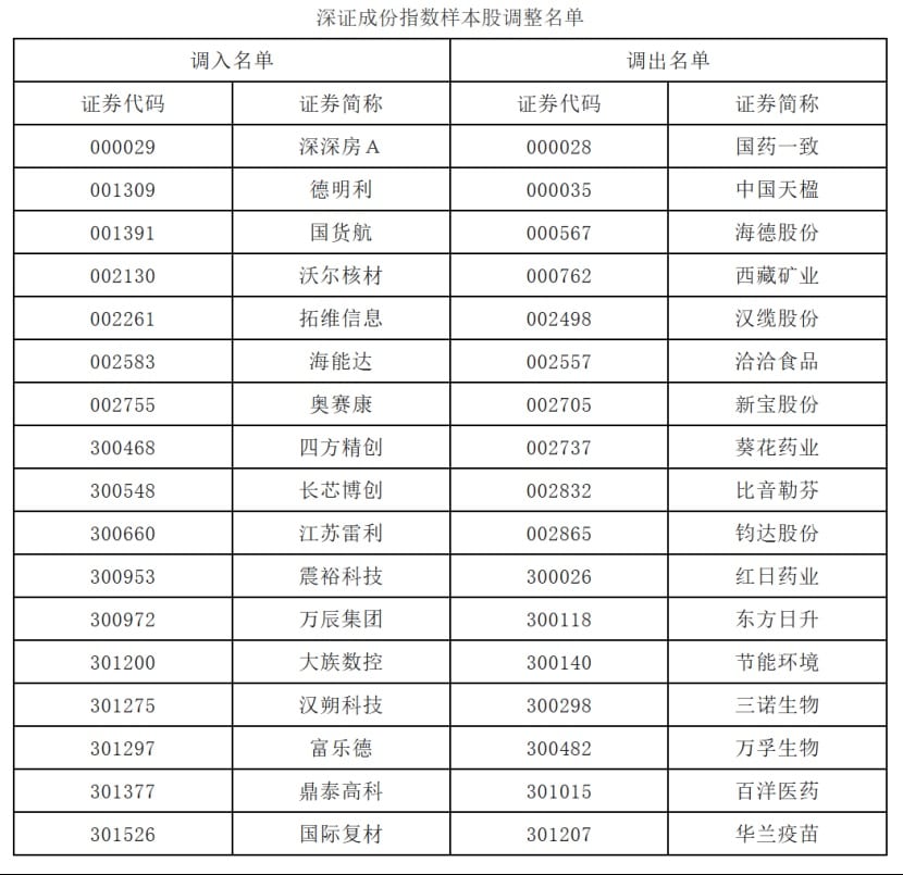 其中,深证成指样本股调入德明利、沃尔核材、拓维信息、四方精创、长芯博创、大族数控等,调出国药一致、中国天楹、海德股份、西藏矿业、洽洽食品、新宝股份等。