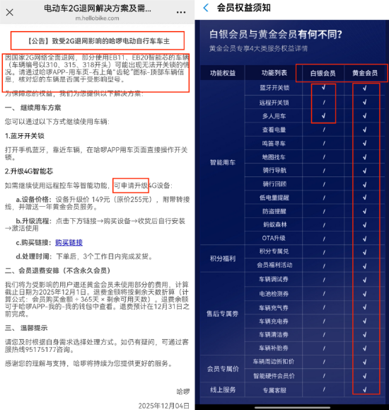 在哈啰 App 内,哈啰对此次变故的原因作了简单解释:「因国家 2G 网络全面退网,部分使用 EB11、EB20 智能芯的车辆可能出现无法开关锁的情况」。而公司给出的继续用车方案则是:用户可通过蓝牙启动开关锁,或自费购买 「4G 智能芯」,对于被影响的用户只承诺退还不含永久会员的部分会员费。