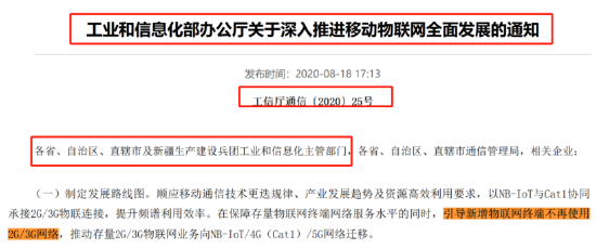 《BUG》 栏目注意到,早在 2020 年 8 月,工信部就曾印发 《关于深入推进移动物联网全面发展的通知》,要求 「引导新增物联网终端不再使用 2G/3G 网络」。