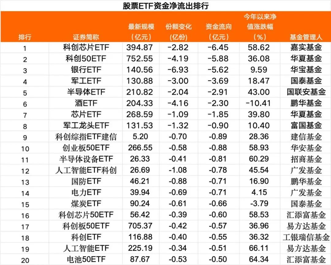 在股票 ETF 中,当日 7 只股票 ETF 净流出超过 1 亿元,部分行业主题净流出靠前,科创 50、科创综合等宽基 ETF,以及科创芯片、银行、军工等行业主题 ETF 是资金净流出较多的品种。