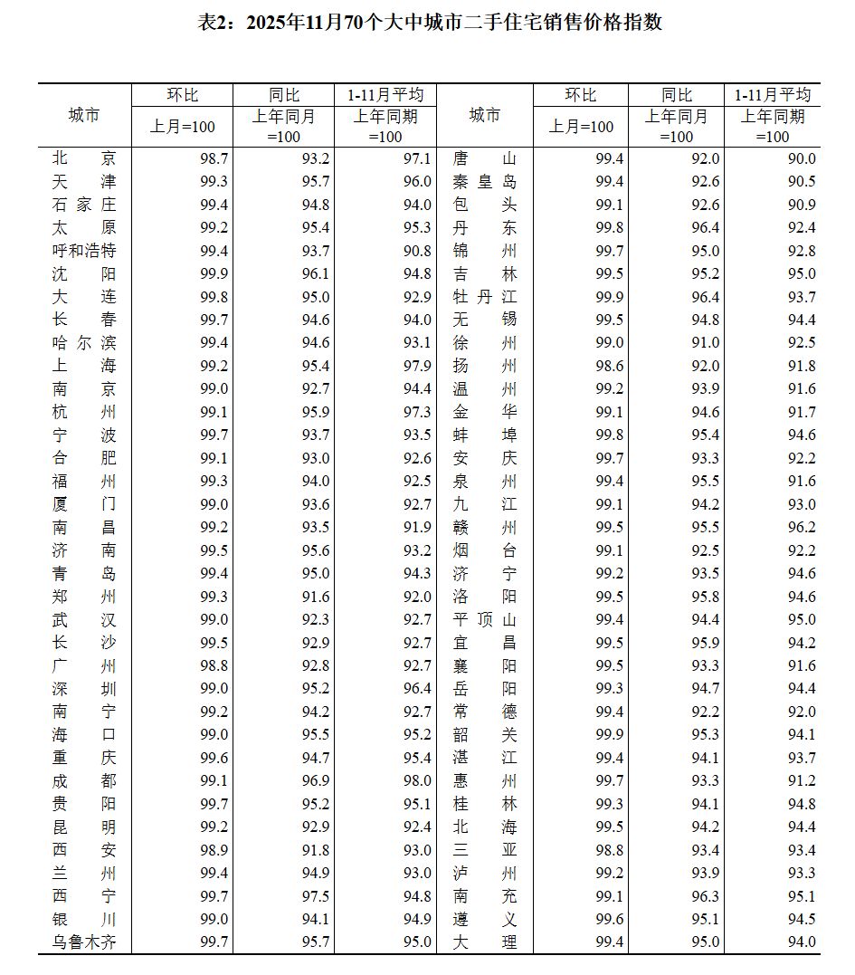 2025 年 11 月份,70 个大中城市商品住宅销售价格环比总体下降、同比降幅扩大。