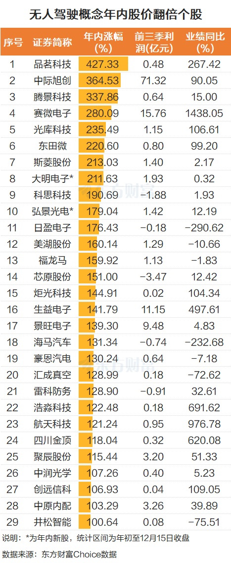 个股而言,品茗科技暂居无人驾驶概念 「涨幅王」 位置,年内累计上涨 427.33%。该股前三季度归母净利润为 0.48 亿元,同比增长 267.42%。
