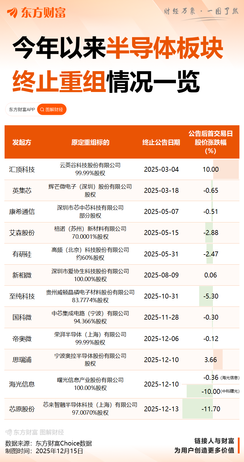 尤其引人注目的是,多家半导体领域上市公司在近期接连 「刹车」——12 月 12 日晚,芯原股份(688521.SH) 宣布终止收购芯来智融 97.0070% 股权,原因是 「标的公司管理层及交易对方提出的核心诉求及关键事项与市场环境、政策要求及公司和全体股东利益存在偏差」。紧随其后,海光信息(688041.SH) 与中科曙光(603019.SH) 于 12 月 10 日同步公告终止吸收合并计划,称 「交易相关事项无法在预计时间内达成一致」。思瑞浦(688536.SH)、帝奥微(688381.SH) 等半导体企业也在近期相继宣告终止并购重组。