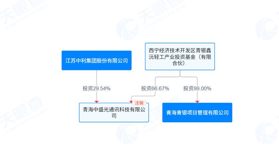 不过,《每日经济新闻》 记者查询天眼查发现,青海青银成立于 2024 年,西宁经济技术开发区青银鑫沅轻工产业投资基金 (有限合伙)(以下简称 「西宁青银基金」) 为其控股股东,持股比例为 99%。而西宁青银基金及中利集团又均为青海中盛光通讯科技有限公司 (以下简称 「青海中盛」) 的持股股东。其中,西宁青银基金持有青海中盛股份的比例为 66.67%;中利集团的持股比例为 29.54%。2018 年 5 月 15 日,青海中盛被注销。