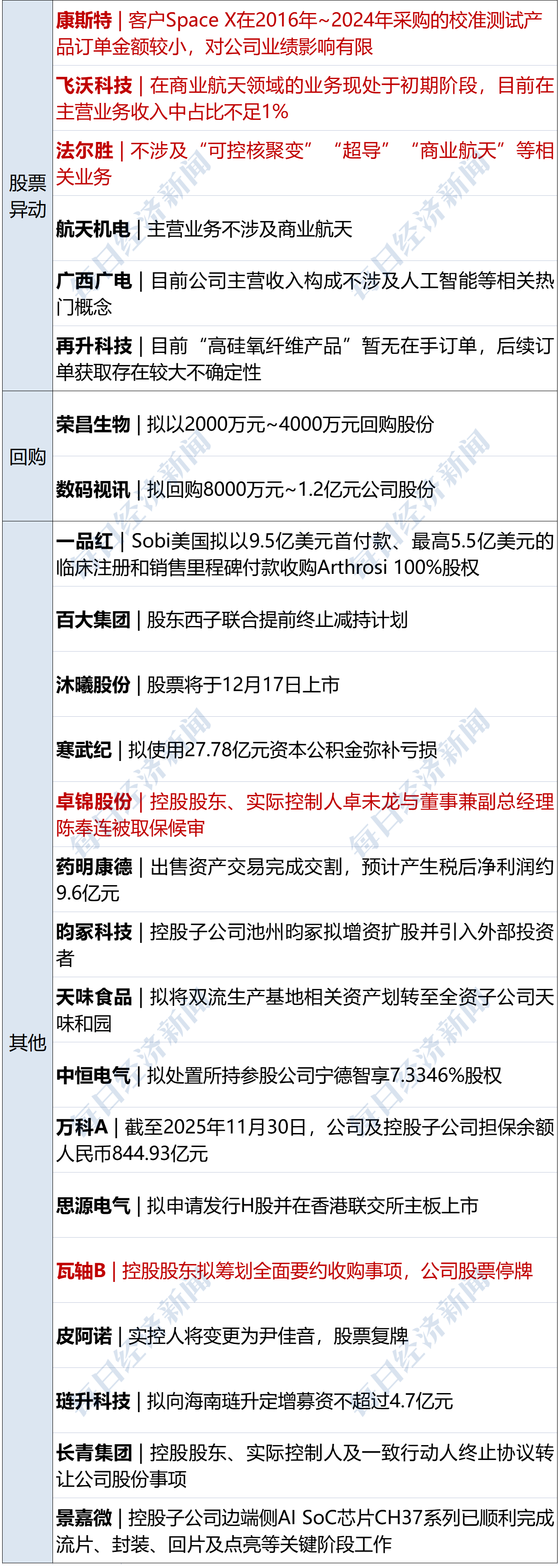 贵州茅台 (SH600519,股价 1426 元,市值 1.79 万亿元):近日,一张标题为 《贵州茅台酒股份有限公司关于产品供应及结构改革的通知》 的文件在社交平台上流传,其署名为 「贵州茅台酒股份有限公司」 并加盖了公司印章,落款时间为 2025 年 12 月 13 日。该通知内容包含贵州茅台对 2026 年的中长期结构性改革,称将立即暂停向经销商发放所有茅台产品 (预付款已完成),暂停时间至 2026 年 1 月 1 日,春节前视情况再行恢复,并规定 「飞天茅台低于 1650 元出货的,立即取消经销商资格」。12 月 15 日,茅台方面表示 「这个文件是假的」。媒体报道显示,贵州茅台对于未来市场政策具体策略可能会在 28 日左右的渠道商联谊会上正式发布。(九派新闻)