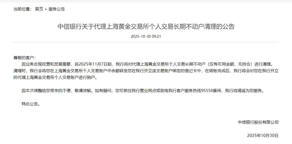 不只是国有大行,股份行亦有行动。中信银行便在 10 月 30 日称,因业务合规经营和发展需要,自 11 月 7 日起,将对代理上海黄金交易所个人交易长期不动户 (仅有可用金额,无持仓) 进行清理。清理时,该行会将客户在上海黄金交易所个人交易账户中余额转至客户在该行开立该交易账户绑定的借记卡中,在转账完成后,该行将会对客户在该行开立的代理上海黄金交易所个人交易账户进行销户。