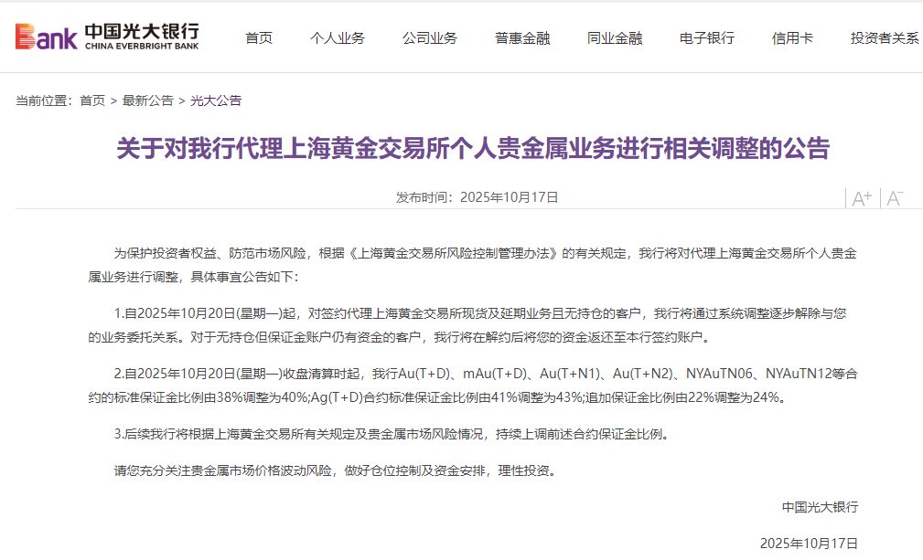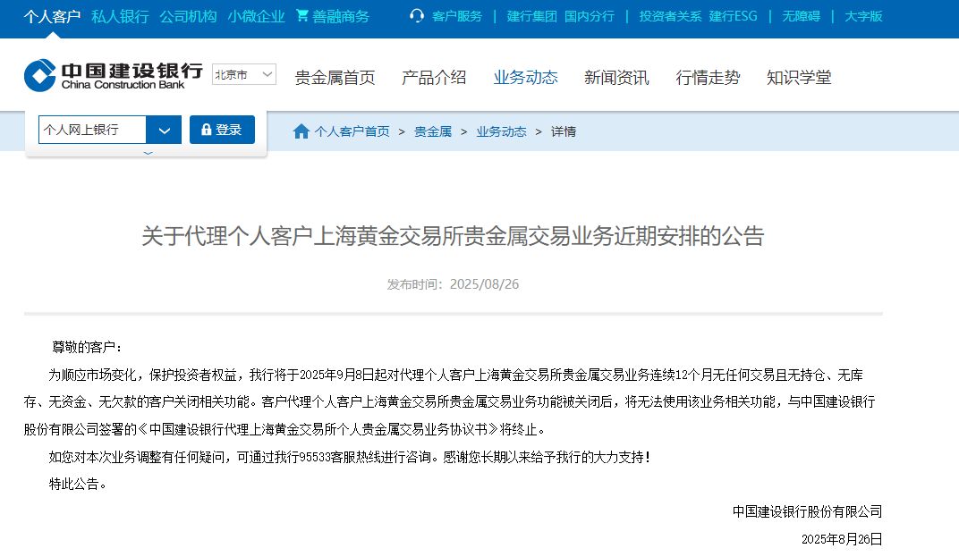 公告称,为顺应市场变化,保护投资者权益,我行对于代理上海黄金交易所个人贵金属交易业务将加强管理。无持仓、无库存、无欠款、保证金账户仍有资金余额的客户,请尽快自助办理资金转出手续。我行将自 2025 年 12 月 19 日起,将上述客户的保证金账户余额批量转出至该业务绑定的结算账户,并关闭相关业务功能。关闭后,客户与我行签署的 《代理个人客户贵金属竞价交易业务协议书》 将终止。