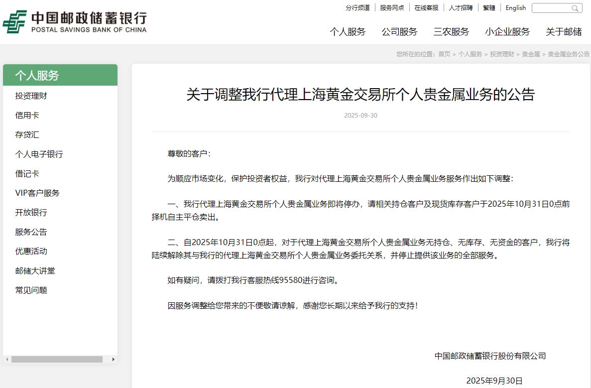 邮储银行 9 月 30 日宣布,该行代理上海黄金交易所个人贵金属业务即将停办,要求相关持仓客户及现货库存客户于 10 月 31 日 0 点前择机自主平仓卖出。同时自 10 月 31 日 0 点起,对于代理上海黄金交易所个人贵金属业务无持仓、无库存、无资金的客户,该行将陆续解除其与该行的代理上海黄金交易所个人贵金属业务委托关系,并停止提供该业务的全部服务。