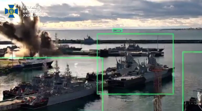 乌国家安全局公布的炸毁俄 「华沙女人」 级潜艇视频截图。(图片来源:央视新闻)