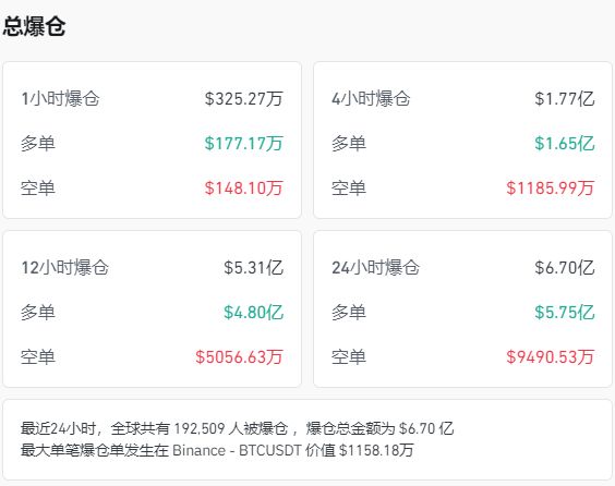 coinglass 数据显示,24 小时超 19 万人爆仓,6.70 亿美元 (约合人民币 47 亿元) 灰飞烟灭。