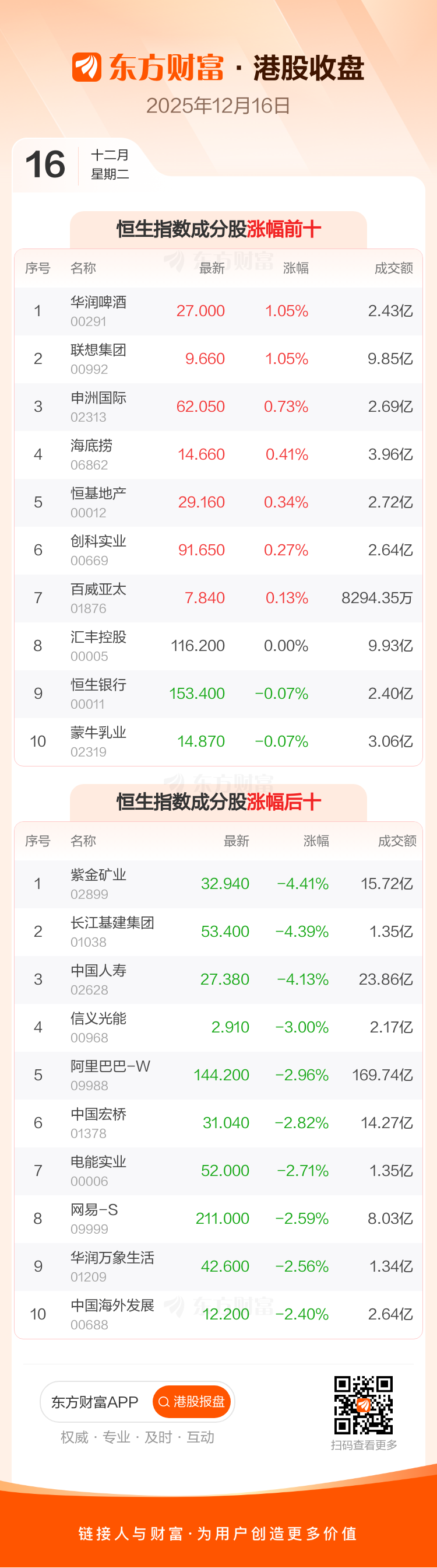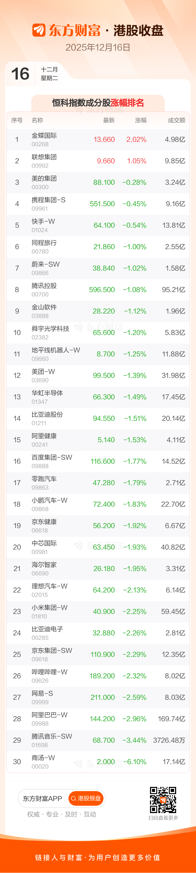 港股 12 月 16 日收盘走低,恒生指数收报 25235.41 点,跌 393.47 点,跌幅 1.54%;恒生科技指数收报 5402.51 点,跌 95.91 点,跌幅 1.74%。恒生指数成分股中华润啤酒、联想集团、申洲国际涨幅居前,紫金矿业、长江基建集团、中国人寿跌幅靠前。恒生科技指数成分股中金蝶国际、联想集团、美的集团涨幅居前,商汤-W、腾讯音乐-SW、阿里巴巴-W 跌幅靠前。