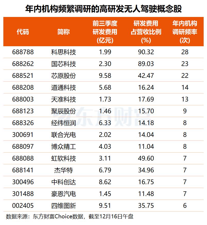 在上述 43 只高研发强度的无人驾驶概念股中,有 14 股今年以来获得 5 次以上机构调研,其中,科思科技年内接待机构调研频率达 28 次,国芯科技、芯原股份也分别有 23 次、22 次机构前往调研,道通科技、天准科技机构调研次数均超 10 次。