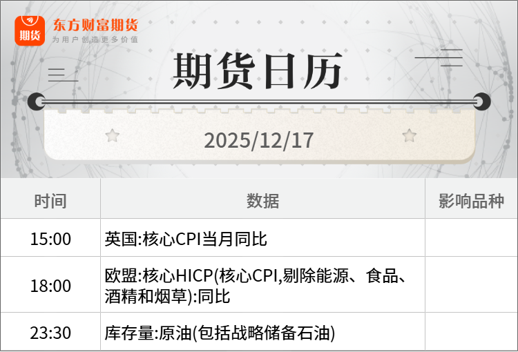 原油:中东原油基准迪拜原油正显示出供应过剩加剧的迹象,迪拜原油的远期曲线正在迅速走弱。亚洲交易商和炼油商以迪拜原油为基准进行交易。据知情交易员和经纪商称,1 月和 2 月合约之间的价差在周二早盘一度变为负值,为每桶负 2 美元。(财联社)