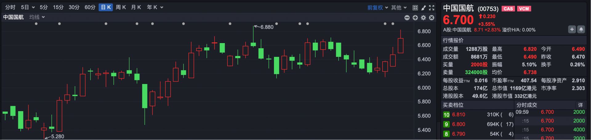 航空股本周维持强势,中国国航 (HK00753) 涨超 3%,中国南方航空股份涨超 4%,中国东方航空股份涨超 5%。