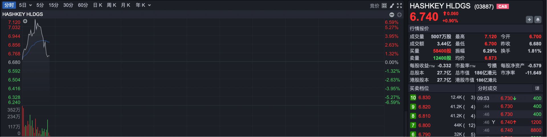 新股方面,今日 HASHKEY HLDGS(HK03887) 上市交易,早盘高开 0.3%,随后一度涨超 6%。