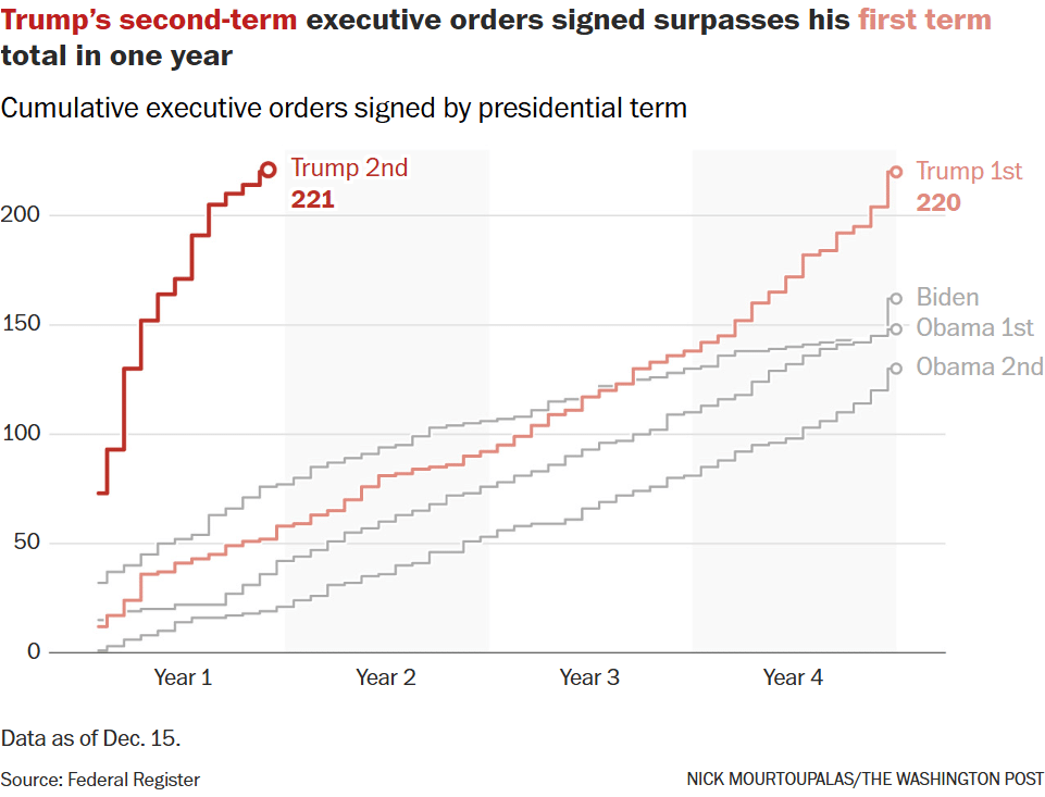 本周一,特朗普签署一项行政令,下令将芬太尼列为 「大规模杀伤性武器」,这已是他第二任期内的第 221 道行政令。自就职以来,他凭借行政令推行大范围关税政策、报复那些他认定的政敌,还插手各类大小文化事务,上至挑战移民法,下到管控淋浴喷头的出水压力。
