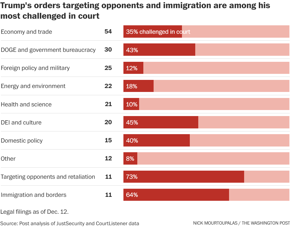 据 《华盛顿邮报》 依据非营利组织 CourtListener 与 JustSecurity 的数据展开分析,截至 12 月 12 日,特朗普签署的行政令中有三分之一已遭到明确的司法诉讼。