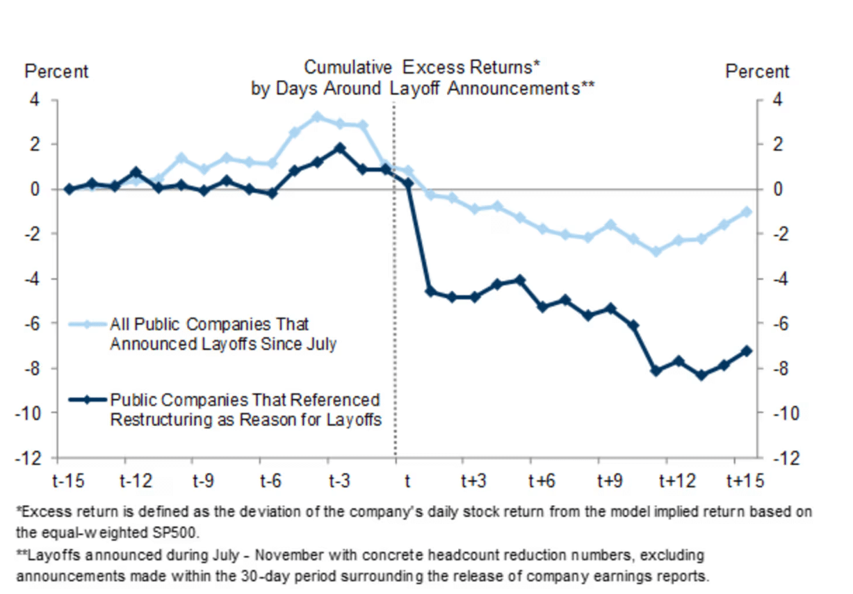 高盛发现,近期的趋势是,公司往往将裁员归因于由自动化和技术进步推动的 「良性」 重组计划。虽然这类公司的股价表现落后大盘 2%,但那些明确告诉投资者裁员原因是 「重组」 的公司,跌幅更为惨重,平均跑输大盘 7%。