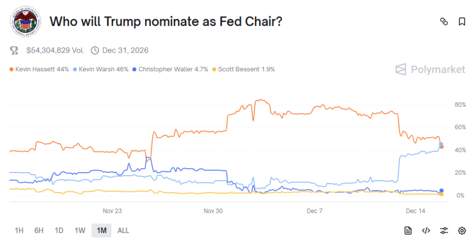 在特朗普发表上述言论前,博彩网站 Polymarket 曾将哈塞特列为头号热门,但如今其获任概率从 75% 降至 44%,而沃什的概率则从 14% 飙升至 46%。
