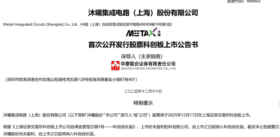 12 月 17 日,国产 GPU 第二股沐曦股份即将登陆科创板。由于沐曦股份尚未盈利,自上市之日起将纳入科创成长层。