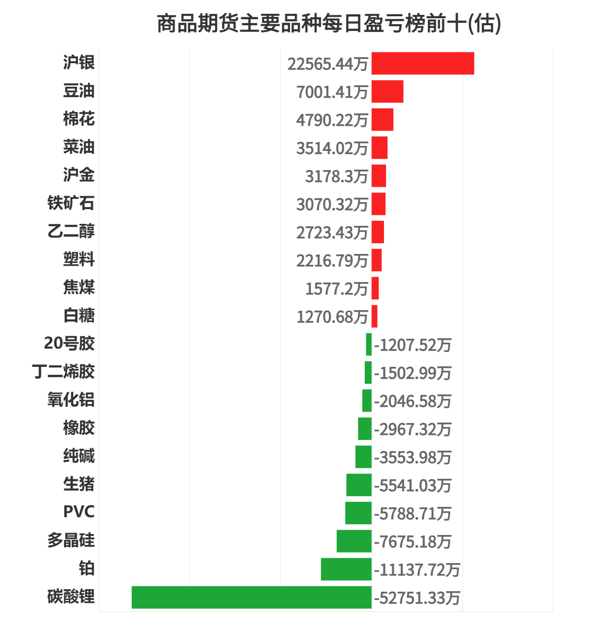 今日商品期货上榜机构席位中沪银盈利第一,为 22565.44 万元。