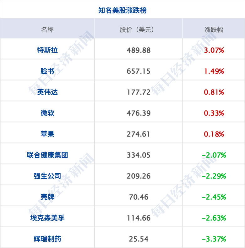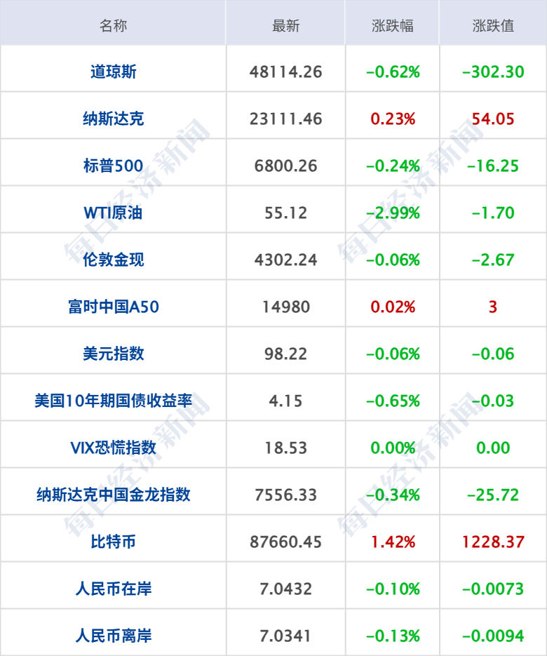 美股三大指数收盘涨跌不一,道指跌 0.63%,纳指涨 0.23%,标普 500 指数跌 0.24%,特斯拉涨超 3% 创上市以来新高,Meta 涨超 1%;加密货币概念、计算机硬件板块涨幅居前,Hut 8 涨近 4%,Strategy、SanDisk 涨超 3%,昆腾涨近 3%,戴尔科技涨超 2%,西部数据、惠普涨超 1%;油气、能源板块跌幅居前,英国石油跌超 4%,壳牌、埃克森美孚、雪佛龙跌超 2%。纳斯达克中国金龙指数跌 0.34%,中概股涨跌不一,知乎涨超 3%,金山云涨超 2%,爱奇艺、网易、世纪互联、拼多多跌超 1%。