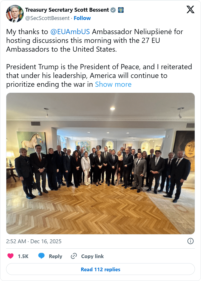 知情人士透露,美国财政部长斯科特·贝森特 (Scott Bessent) 本周早些时候会见一群欧洲大使时,就相关计划进行了磋商。他在会后通过社交媒体平台 X 发文称:「特朗普总统是和平总统,我重申,在他的领导下,美国将继续把结束乌克兰冲突列为优先事项。」
