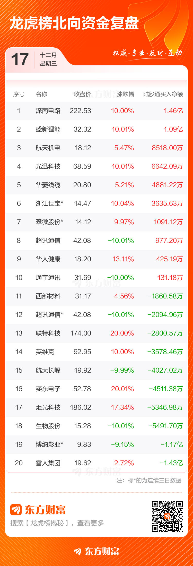 12 月 17 日共有 55 只个股 (含 1 只可转债) 上榜龙虎榜,总上榜成交额 219.30 亿元。上榜个股中净买入额最高的是深南电路,金额为 2.68 亿元。