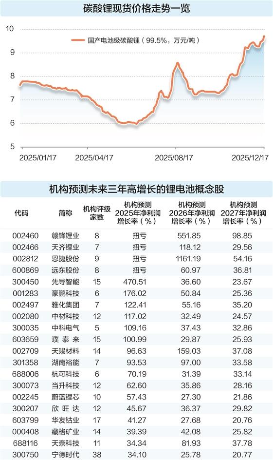在动力电池持续增长、储能电池需求超预期背景下,机构持续看好锂电池概念股未来前景。根据 10 家及以上机构一致预测,25 股 2025—2027 年归母净利润增长率有望超过 20%,包括宁德时代、赣锋锂业、藏格矿业、华友钴业4 只市值千亿元的龙头股。