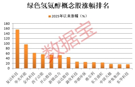 据证券时报·数据宝统计,A 股市场上目前布局绿色氢氨醇相关业务的概念股有 17 只。截至 12 月 17 日收盘,绿色氢氨醇概念股合计 A 股市值 2815.12 亿元。今年以来,6 只概念股涨幅超过 50%,分别是复洁科技、华光环能、金风科技、西子洁能、开山股份、新锦动力。