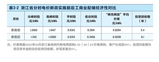 分时电价调整后,浙江省的平均电价差从 0.83 元/千瓦时缩小至 0.50 元/千瓦时,投资回收期由 5.4 年变为 9.1 年