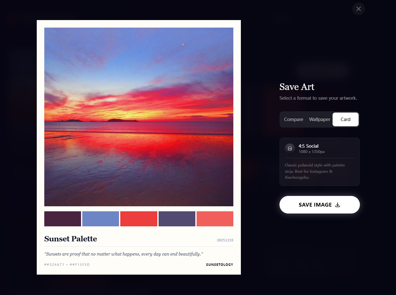 谁还在手动抠日落颜色啊!这个日落岛平替网站也太香了😭 不用等 iOS 专属,电脑手机浏览器直接冲~ 传一张晚霞照片,一秒提取 8 种主色调,自动生成渐变壁纸、艺术色卡,连对比图都直接弹出来~ 橙粉紫的落日氛围感被拆成可直接用的素材,做手账、P 图、做头像都超适配!关键是客户端本地处理,不泄露照片还飞快,喜欢落日氛围的赶紧收藏!