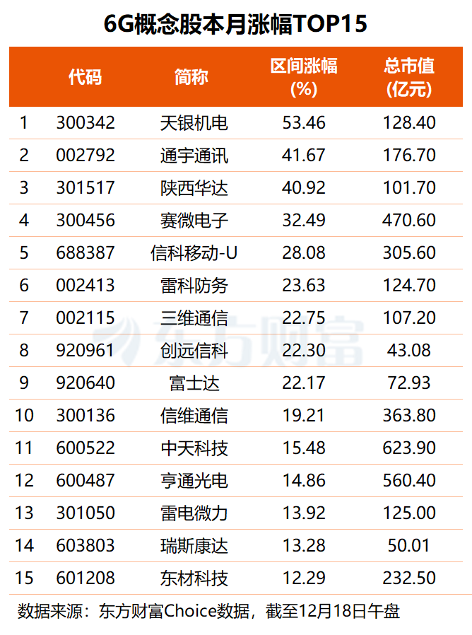 6G 概念股早盘表现强势,天银机电20cm 涨停,瑞斯康达封板,信科移动、通宇通讯、富士达等多股跟涨。