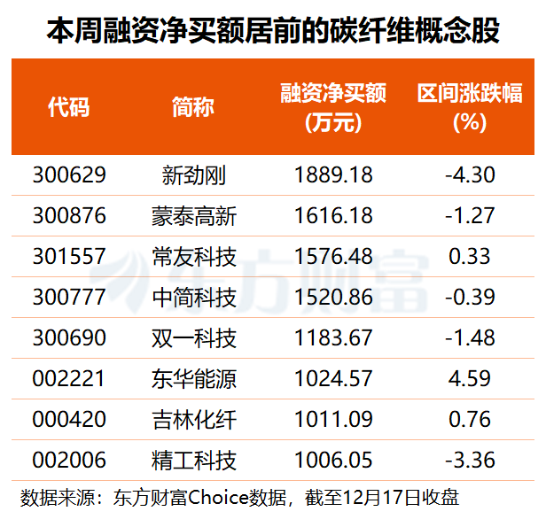 东方财富Choice 数据显示,本周以来,共有 15 只碳纤维概念股获融资净买入,其中 8 股净买额规模超千万元,新劲刚获融资客抢筹 1889 万元,蒙泰高新、常友科技分别获 1616 万和 1576 万元融资净买入。
