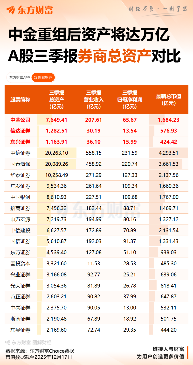 合并后,中金公司将成为行业第四家总资产跨入 「万亿俱乐部」 的券商。业内人士普遍认为,中金公司合并东兴证券、信达证券,正是剑指国际一流投行建设的决心体现。