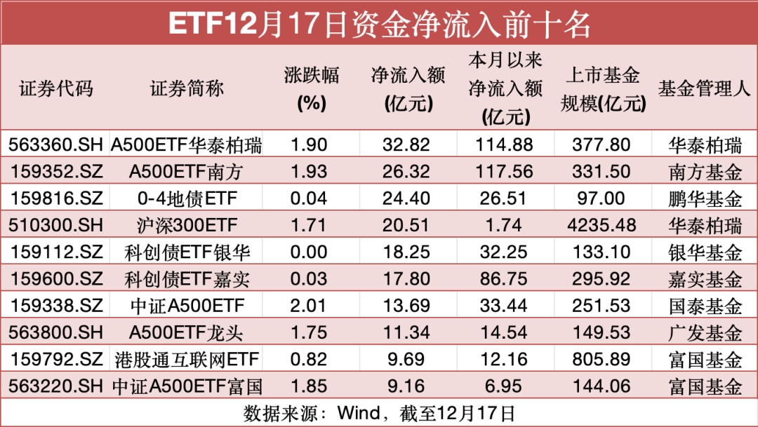 多只宽基 ETF 位居当日资金净流入榜前十名。其中,A500ETF 华泰柏瑞资金净流入超过 32 亿元,A500ETF 南方、华泰柏瑞沪深 300ETF 资金净流入均超过 20 亿元。全市场 32 只中证 A500ETF 合计资金净流入超过 110 亿元。