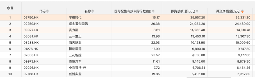 这些巨额募资项目多来自内地。choice 数据显示,宁德时代、紫金黄金国际、赛力斯、三一重工、海天味业年内募资净额居前分别为 353.31 亿元、244.69 亿元、140.16 亿元、133.07 亿元、100 亿元,融资金额均在百亿元以上。