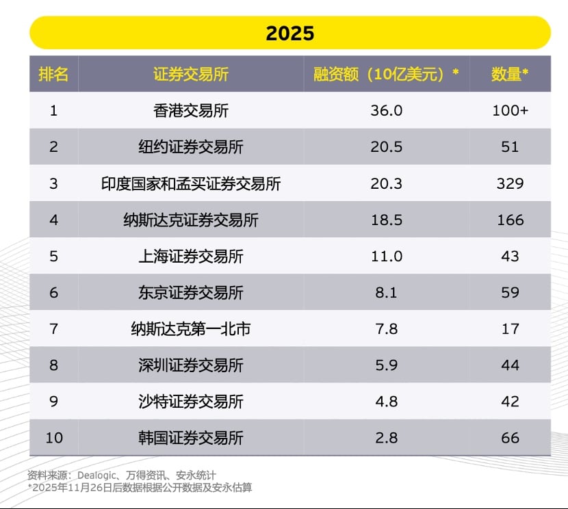 安永预计,港交所全年上市数量将超 100 家,融资额有望冲击 360 亿美元,成为 2025 年全球融资规模最高的交易所。